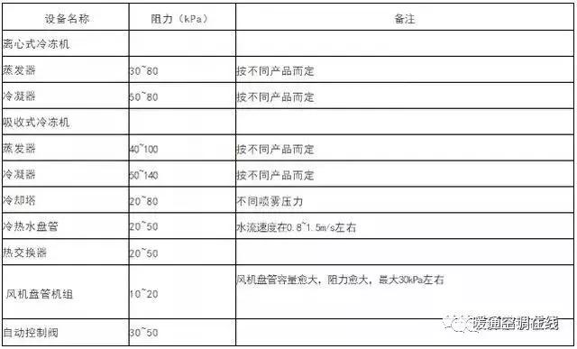 1.冷水機(jī)組阻力:由機(jī)組制造廠提供,一般為 60~100kPa。