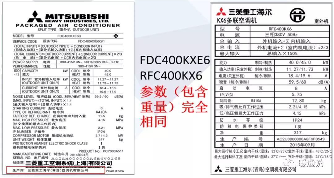 四、三菱重工中央空調(diào)和三菱重工海爾空調(diào)銘牌標(biāo)識(shí)各項(xiàng)參數(shù)數(shù)據(jù)完全一樣!