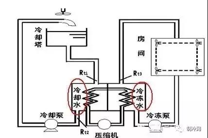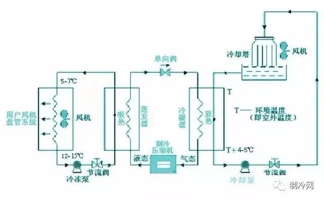 1、主機(jī)和末端通過(guò)冷凍水換熱→冷凍水-冷卻 蒸發(fā)器的水。