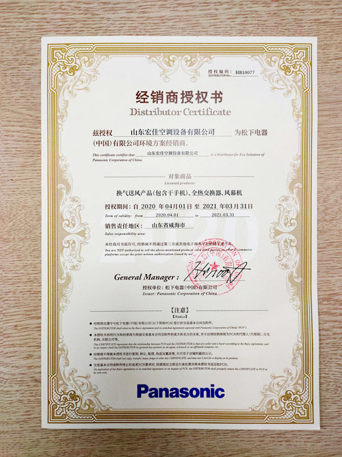 2020年,榮獲松下電器有限公司 授予特約經(jīng)銷商